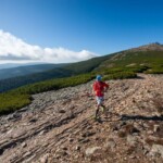 Do PK1 dobiegliśmy w grupie kilkuosobowej. Tzn dystans dzielący nas był na tyle niewielki, że się widzieliśmy. To jeden z nielicznych punktów gdzie było kilkunastu startujących w zakresie mojej widoczności. Generalnie na tym dystansie wystartowało siedemdziesiąt parę osób – to niewiele. Z PK1, obok Odrodzenia, ruszyliśmy Drogą Przyjaźni Polsko-Czeskiej w kierunku Śnieżki. Ten szlak trawersuje grań od północnej strony, więc tam mniej wiało. Dobrze mi się biegło, wiedziałem, że niedługo będą Słoneczniki, a potem piękny widok w dół na Samotnie i dalej na charakterystyczny szczyt Śnieżki. Nie byłem zmęczony – bardzo dużo biegłem, praktycznie cały czas do samego Domu Śląskiego. Wiadomo, wspinanie na kopiec Śnieżki był wyzwaniem. Tego nie planowałem podbiegać. Na podejściu tak wiało, że oberwało mi numer startowy. W ostatniej chwili złapałem go gdy wisiał na ostatniej agrafce. Wspinając się, próbowałem policzyć ile razy w tym roku byłem na tym szczycie. Wyszło mi z matematyki, że chyba już 5 i teraz będzie 6ty:) O rany, ciekawe, kto z lokalesów był tyle razy na Śnieżce w jednym roku. Równo 30km wybił na szczycie Śnieżki. Zbieg ze szczytu to woda na mój młyn – lubię to:)Po drodze mijałem fotografów – mam fajne zdjęcia:) Dzięki.