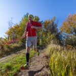 Czułem się dobrze, nie było kryzysów. To już 50km trasy – szczyt Skalnik, potem ciekawa kopalnia dolomitu – super miejsca na rower. Krajobraz był już mocno jesienny. Piękne kolory liści, jeszcze na drzewach, a nie na ziemi powodowały, że trasa była i bardzo piękna i niezbyt śliska:) . Zdjąłem kurtkę. Było już bardzo ciepło. Ja tak mam, że jak nie biegnę w kurtce (a powinienem) to zimno znoszę dość dobrze, natomiast gdy już założę kurtkę a potem się ociepli – trudno mi się z nią rozstać. Teraz zdjąłem, bo chyba było z 18 st.C. W Rudawach jest mnóstwo ciekawych miejsc, a to wielkie głazy, a to ruiny zamku – ciągle coś. Oczy się nie nudziły. Do PK3 w Janowicach Wielkich (60km) dotarłem po 6h30min wyprawy. Tam był przepak i duży paśnik z ciepłą zupą pomidorową. Ale smakowała… Wciągnąłem dwie miski. Było to późne śniadanie, bo rano, przed startem, zjadłem tylko odrobinę. W Janowicach na punkcie wielka impreza – szacun dla ekipy z UltraChojnika 🙂 bo chyba oni rozkręcali tą „dyskotekę”. Janowice Wielkie leżą bardzo blisko Miedzianki – to mój ulubiony lokalny browar. Cóż to była za pokusa aby tam się udać tym bardziej, że teraz miał się zacząć ten trudniejszy etap. Do Radomierza (jeszcze w Rudawach) a potem już w Góry Kaczawskie. Ostatnie kilometry po Rudawach Janowickich były mniej leśne ale także urokliwe. Faktycznie zaczął się trudniejszy moment. Moje zmęczenie już było na poziomie „biegu ultra”. Coś tam bolało ale bez przesady.
